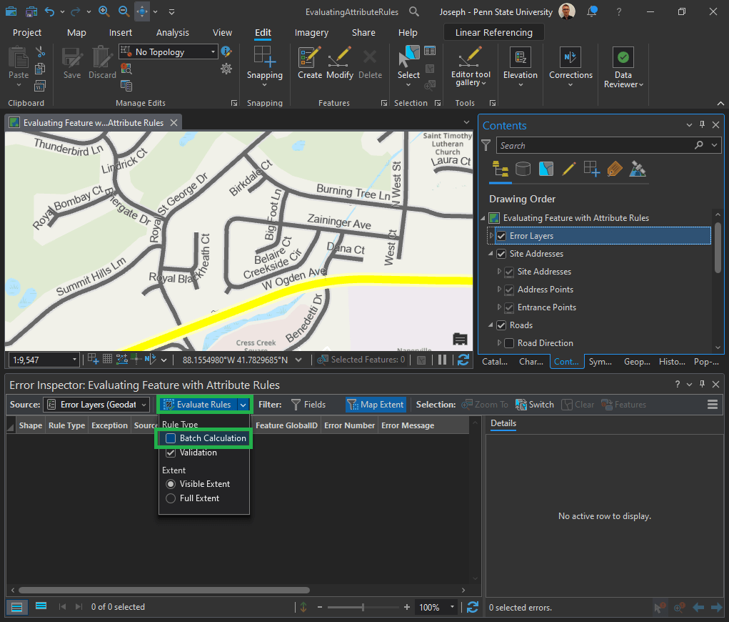 In the Error Inspector pane, click the Evaluate Rules drop-down arrow and uncheck the Batch Calculation check box. Note: Don’t click directly on the “Evaluate Rules” button, we will do that in the next step – but first we need to alter the parameters).