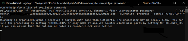 At a certain point, I also realized that there needed to be a more seamless connection between QGIS and PostGIS, especially in regards to the ability to do certain spatial functions more effectively in QGIS and then export the data from QGIS and import it into the database. See endnote for more.[i] Another thing that I wished that I had learned earlier was how to import geodatabases straight into PostGIS. The following post on GIS StackExchange helped greatly.[1] The ogr2ogr tool can be used with the OSGeo4W Shell to import geodatatbases directly.[2] The tool worked quite well for me for a number of geodatabases, but I also found it quite difficult to troubleshoot if the import was not successful.