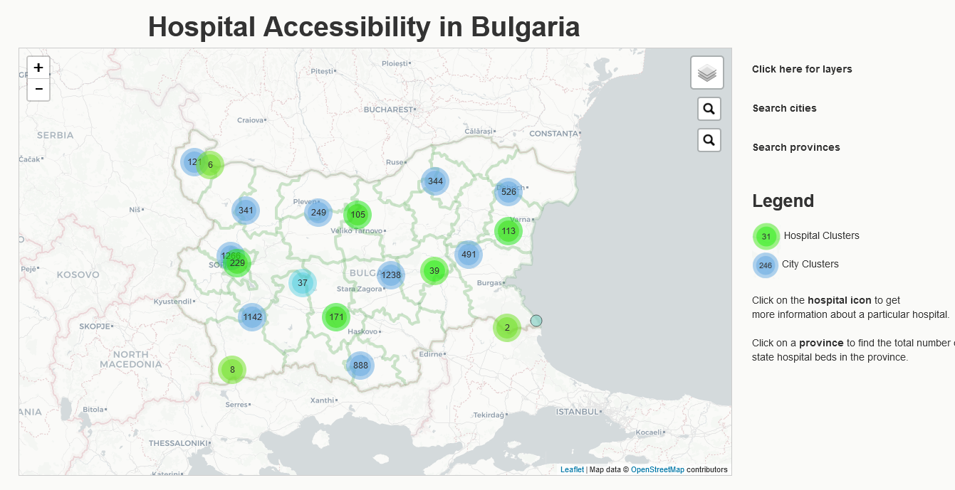 The current capacity of hospitals in Bulgaria is extremely low. Not only that, but GIS data on hospitals in Bulgaria on Open Street Map is still very much incomplete, and is especially lacking fields translated into English, which would be of paramount importance to any who does not speak Bulgarian, whether international aid worker or asylum seeker.